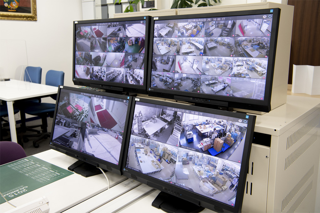 建物出入り口及び建物内(作業現場、保管スペース)に監視カメラを設置しています。